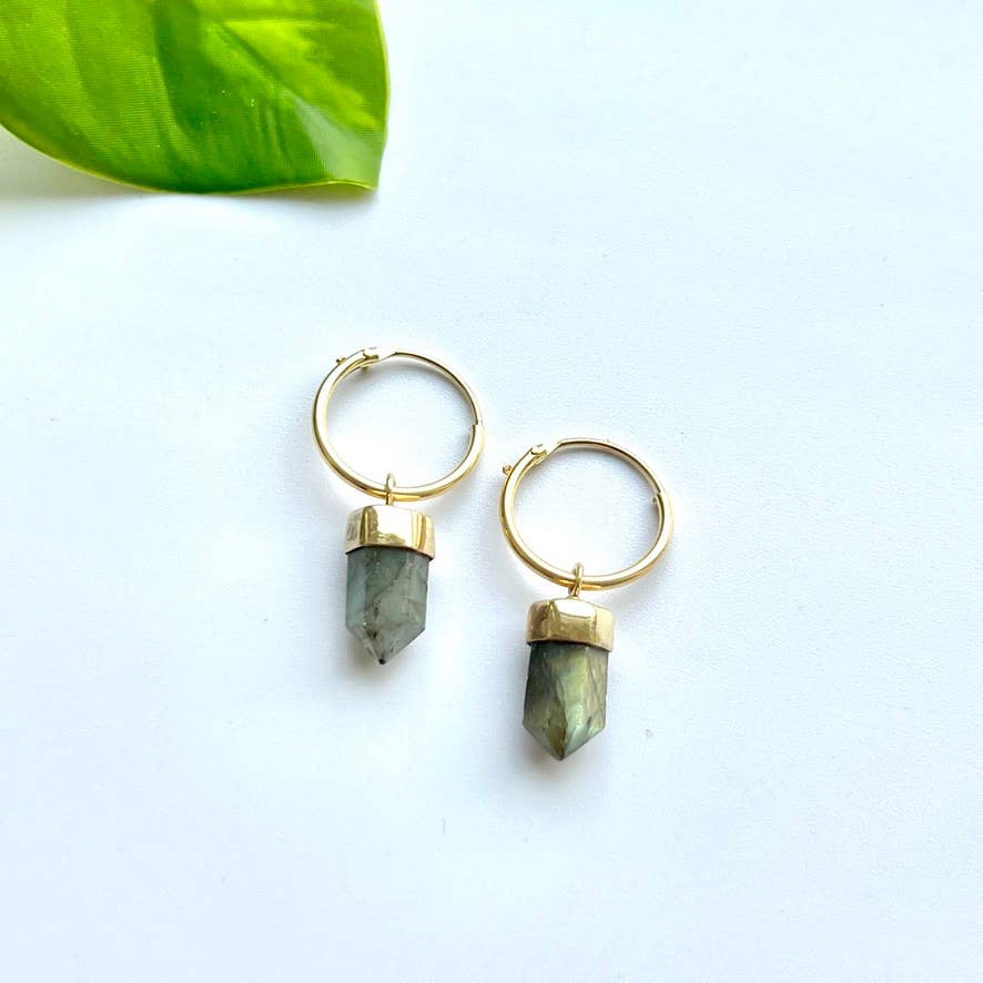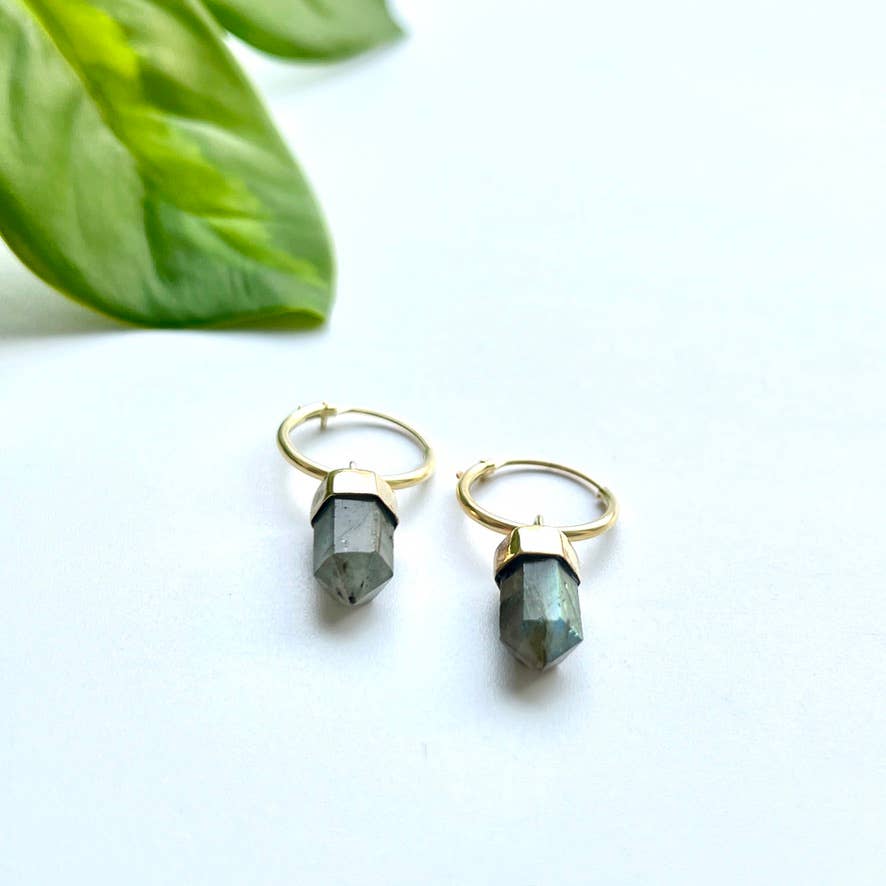 Brass hoop earring with labradorite or amethyst stone point.